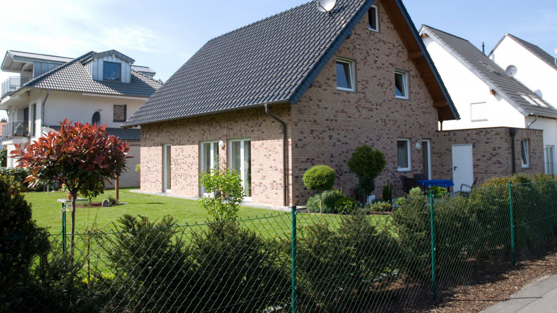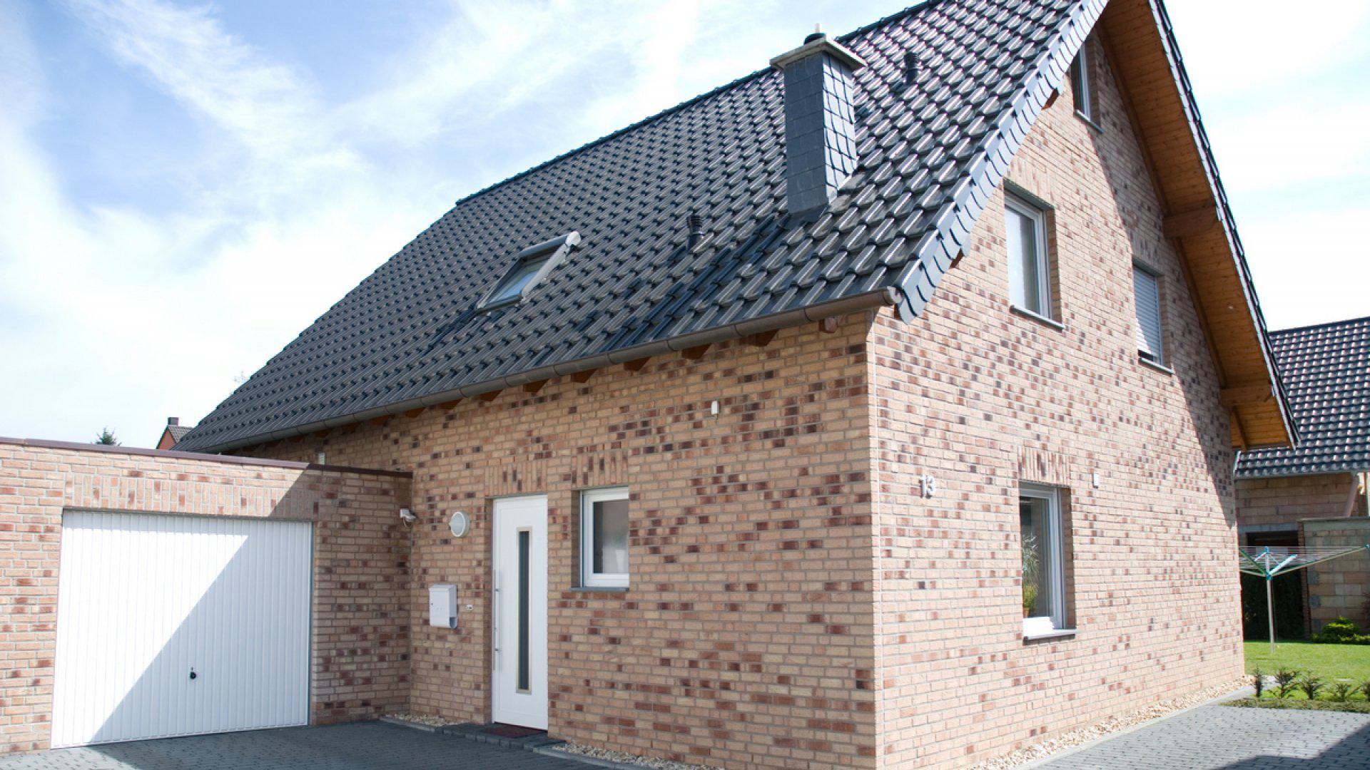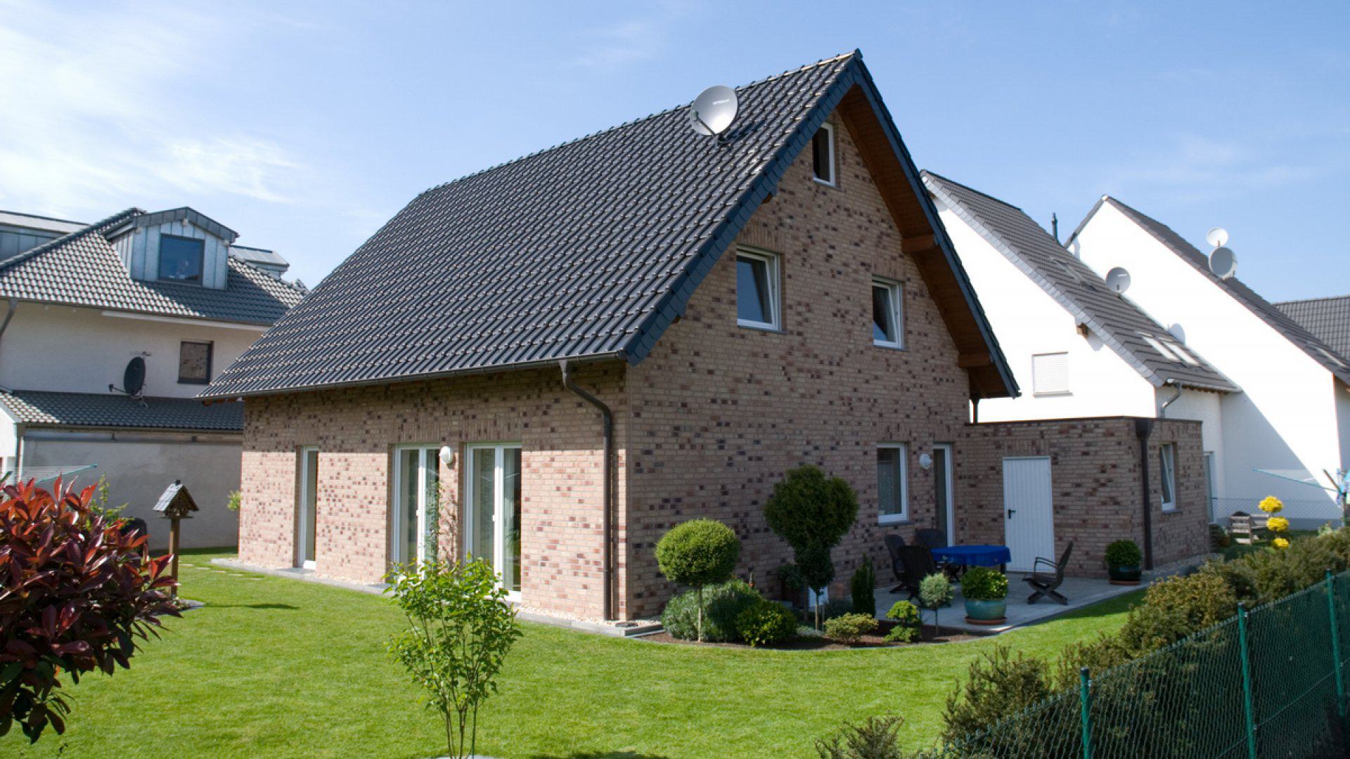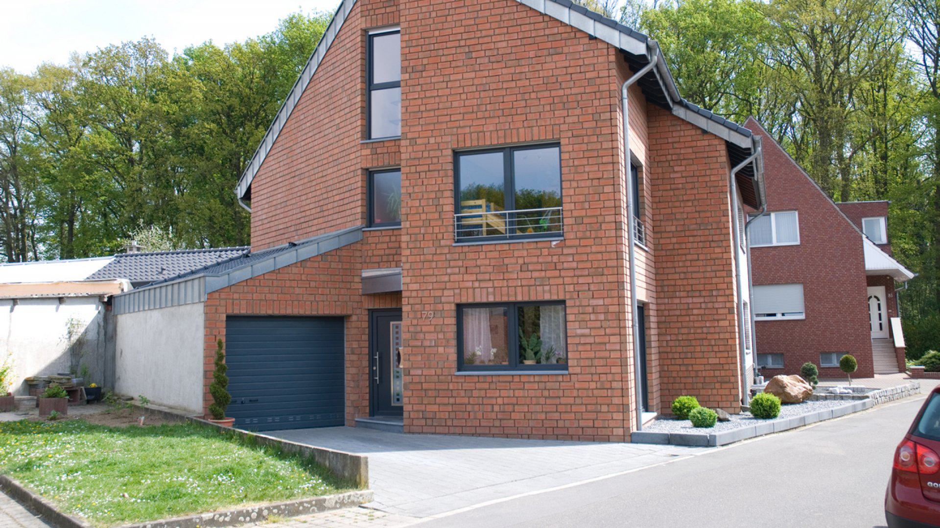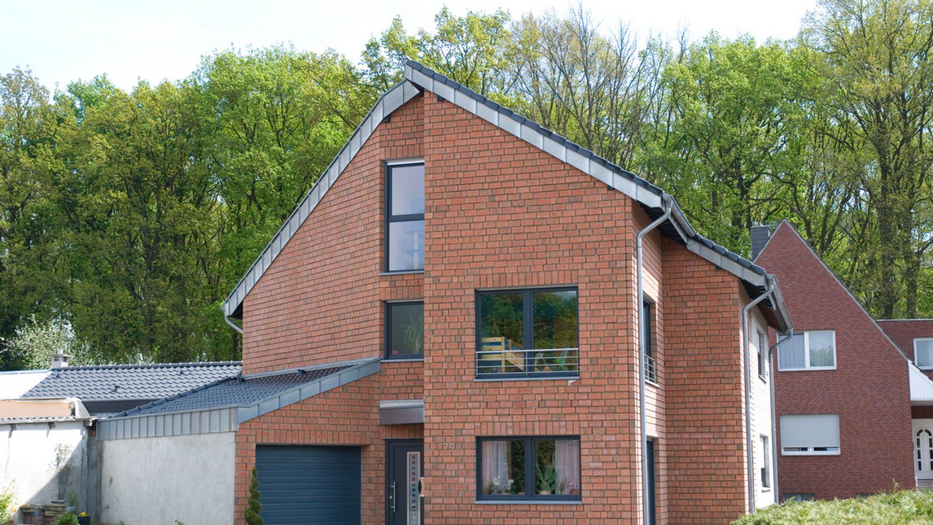 Vollunterkellertes Einfamilienhaus in 1 1/2 geschossiger bauweise mit Fassade aus großformatigem Klinker und Wärmedämmverbundssystem