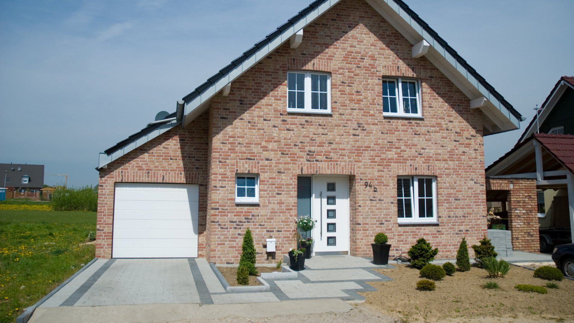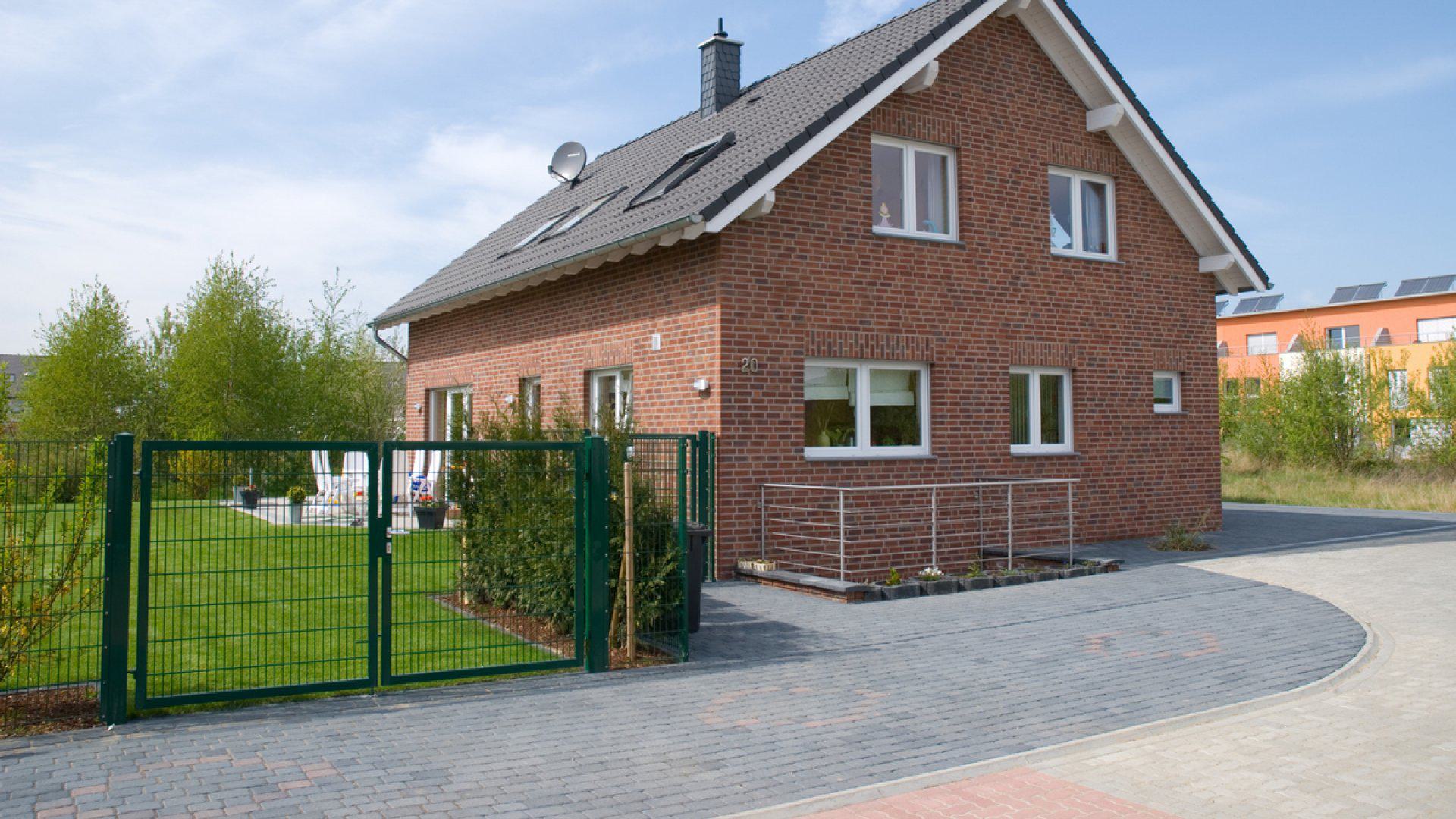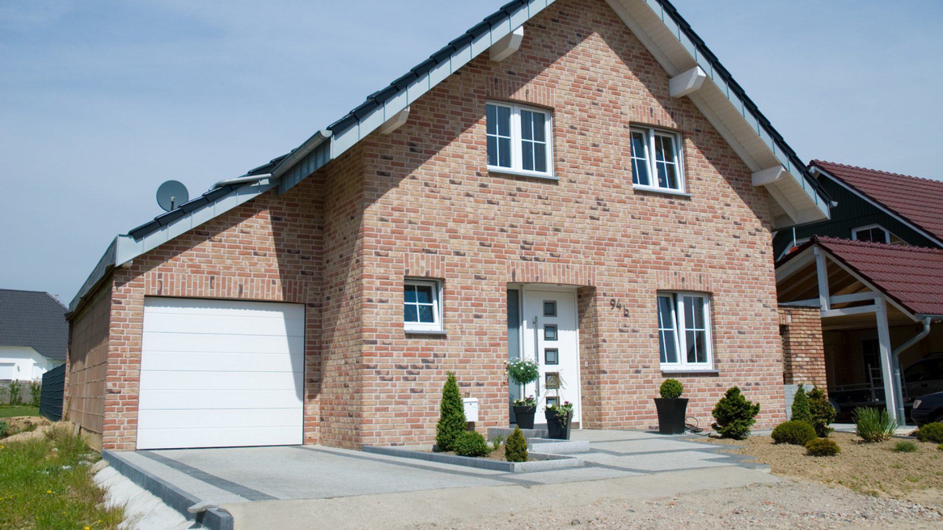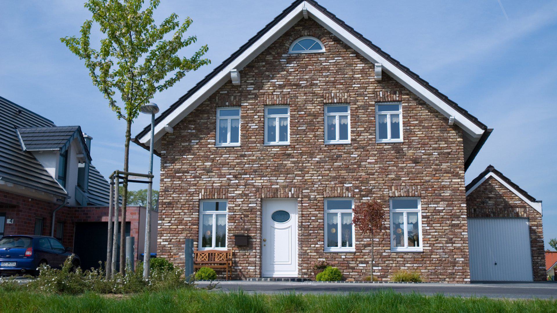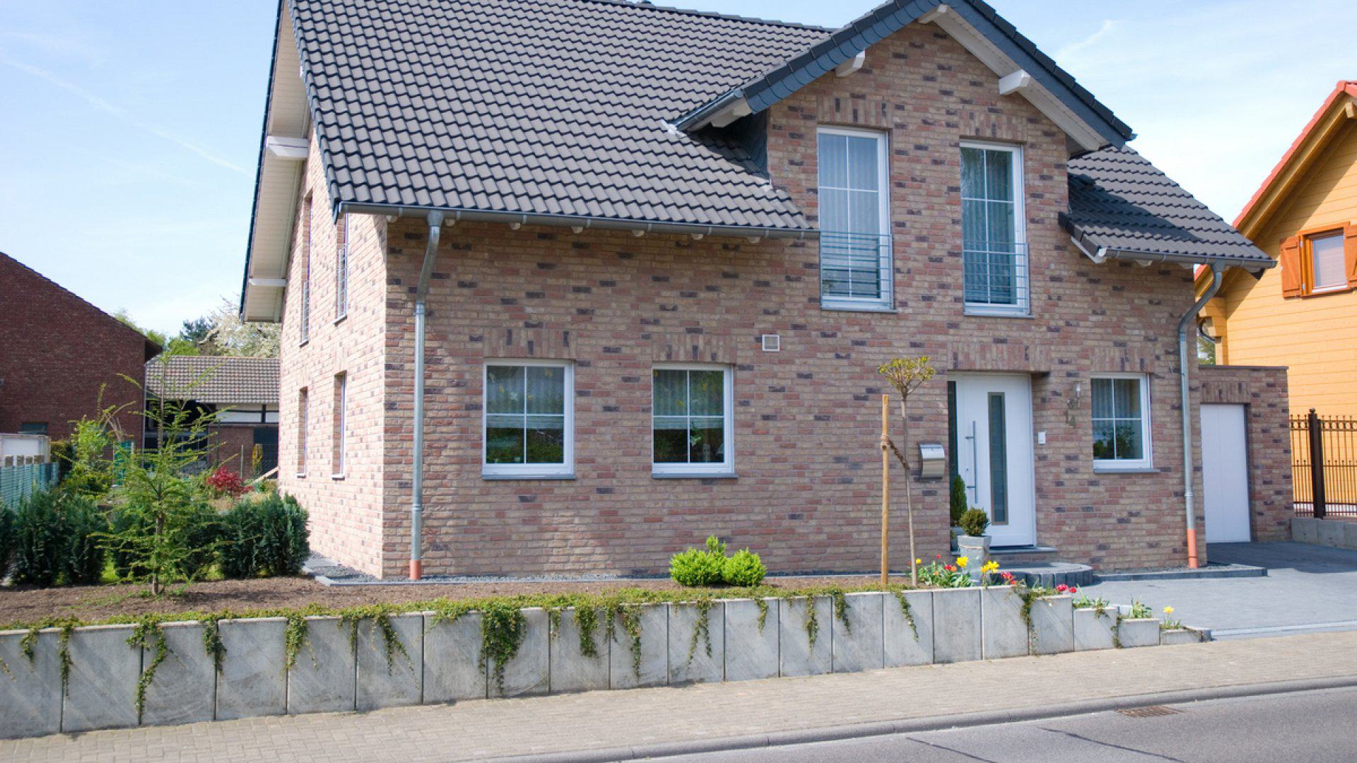 Vollunterkellertes Einfamilienhaus in 1 1/2 geschossiger bauweise mit Fassade aus großformatigem Klinker und Wärmedämmverbundssystem